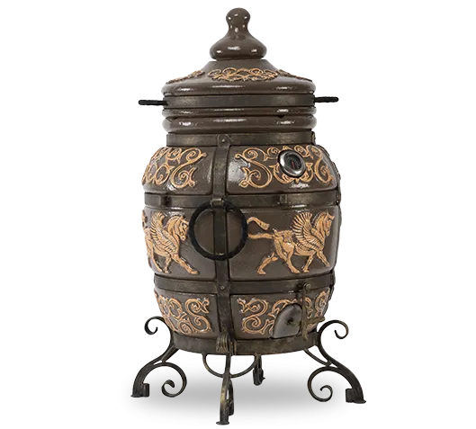Тандыр «Перс Толпар» представлен в коллекции в двух цветах — черный и слоновая кость. Глянцевая глазурь с персидским растительным орнаментом, защищая тандыр от налета пыли, капель жира и влаги, делает его более долговечным. А благодаря крылатому коню Толпар, изображенному на корпусе тандыра, он выглядит весьма эффектно. Это настоящее украшение приусадебного участка.